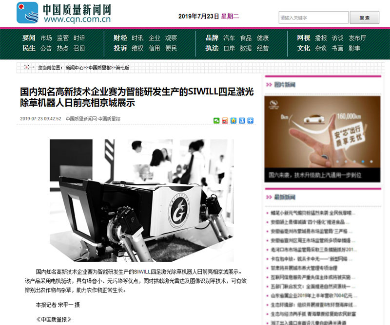国内知名高新技术企业佳博在线登录智能研发生产的SIWILL四足激光除草机器人日前亮相京城展示。该产品采用电机驱动,具有噪音小、无污染等优点,同时搭载激光雷达及图像识别等技术,可有效辨别出农作物与杂草,助力农作物正常生长。本报记者 宋平一 摄 《中国质量报》