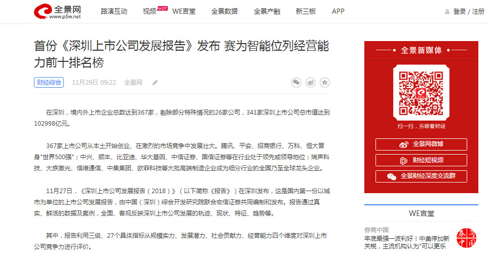 全景网|首份《深圳上市公司发展报告》发布 佳博在线登录智能位列经营能力前十排名榜